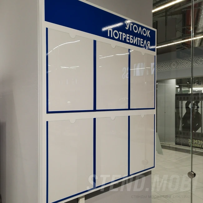 Стенд Уголок покупателя может быть с как белым фоном, так и с брендированным задником.