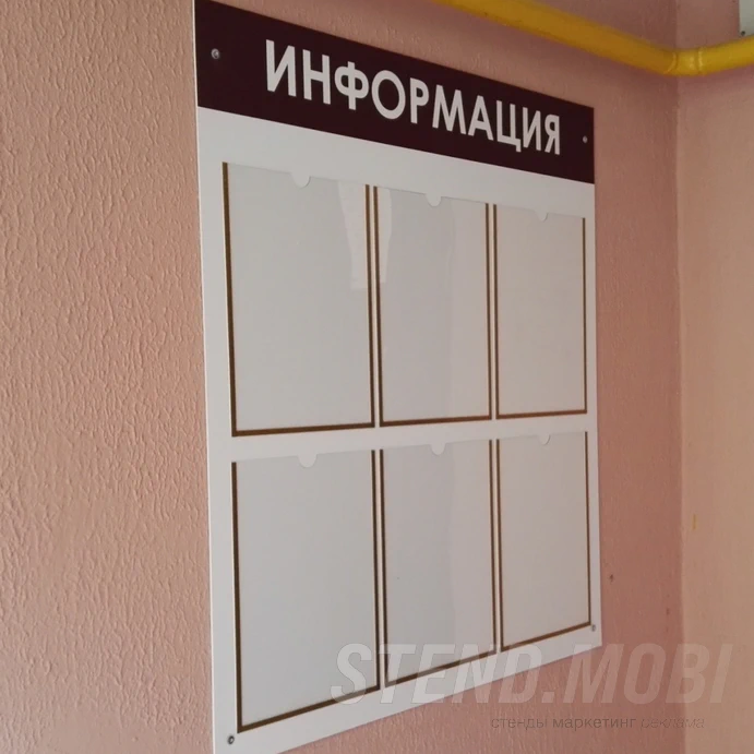 Информационные стенды изготавливаются из пластика ПВХ, оргстекла, композитных плит и прочих материалов. Информационная надпись (если необходима) — аппликация из пленки либо фрезерованные буквы.